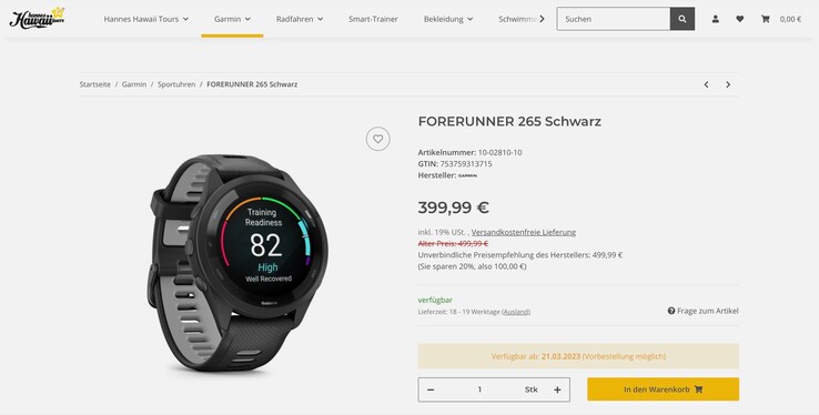 Der Online-Händler Hannes Hawaii Shop bietet die Garmin Forerunner 265 derzeit schon für 399,99 Euro an, was einem Rabatt in Höhe von 100 Euro im Vergleich zur unverbindlichen Preisempfehlung des Herstellers entspricht. Die Forerunner 965 gibts mit 130 Euro Rabatt zum Preis von 519,99 Euro.