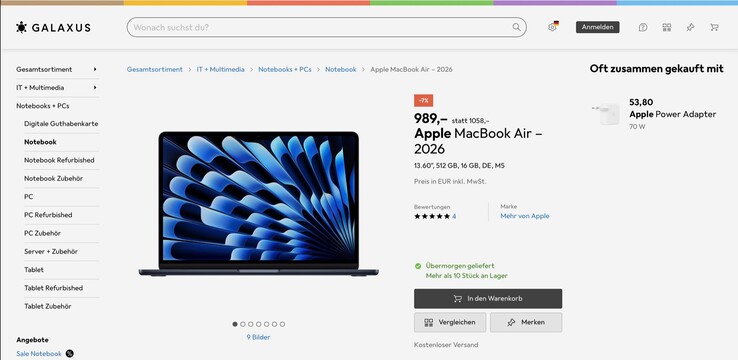 Das MacBook Air mit Apple M5 ist erst Anfang März auf den Markt gekommen, schon kann das Notebook zum Bestpreis bestellt werden. Denn Galaxus bietet das Basismodell mit 16 GB Arbeitsspeicher und 512 GB SSD in der Farbe Midnight, also Schwarz, für nur 989 Euro an, der Versand nach Deutschland ist kostenlos. Dasselbe Modell kostet im Apple Store 1.199 Euro, laut Preisvergleich war das Notebook noch nie zuvor für unter 1.052 Euro zu bekommen.