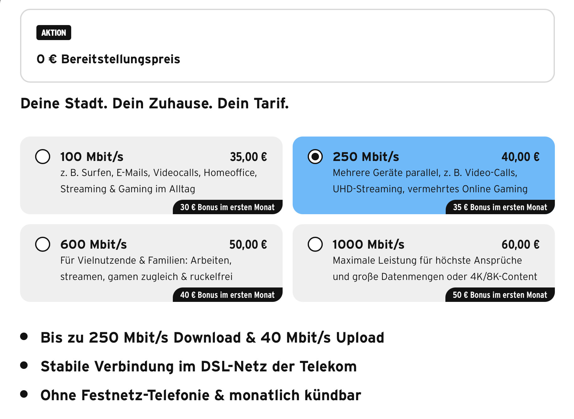 Im Einzelnen profitiert man von folgenden Rabatten: Der Einstieg mit 150 Mbit/s ist für 35 Euro statt 38 Euro möglich, beim 300er-Tarif spart man sogar fünf Euro jeden Monat, da dieser statt 45 Euro nur 40 Euro kostet. Wer noch mehr Speed benötigt, erhält den 600er-Tarif für 55 Euro oder den 1000er-Gigabit-Anschluss für 65 Euro monatlich. Je nachdem, für welchen Tarif man sich entscheidet, gibt es zusätzlich einen Bonus von bis zu 50 Euro.