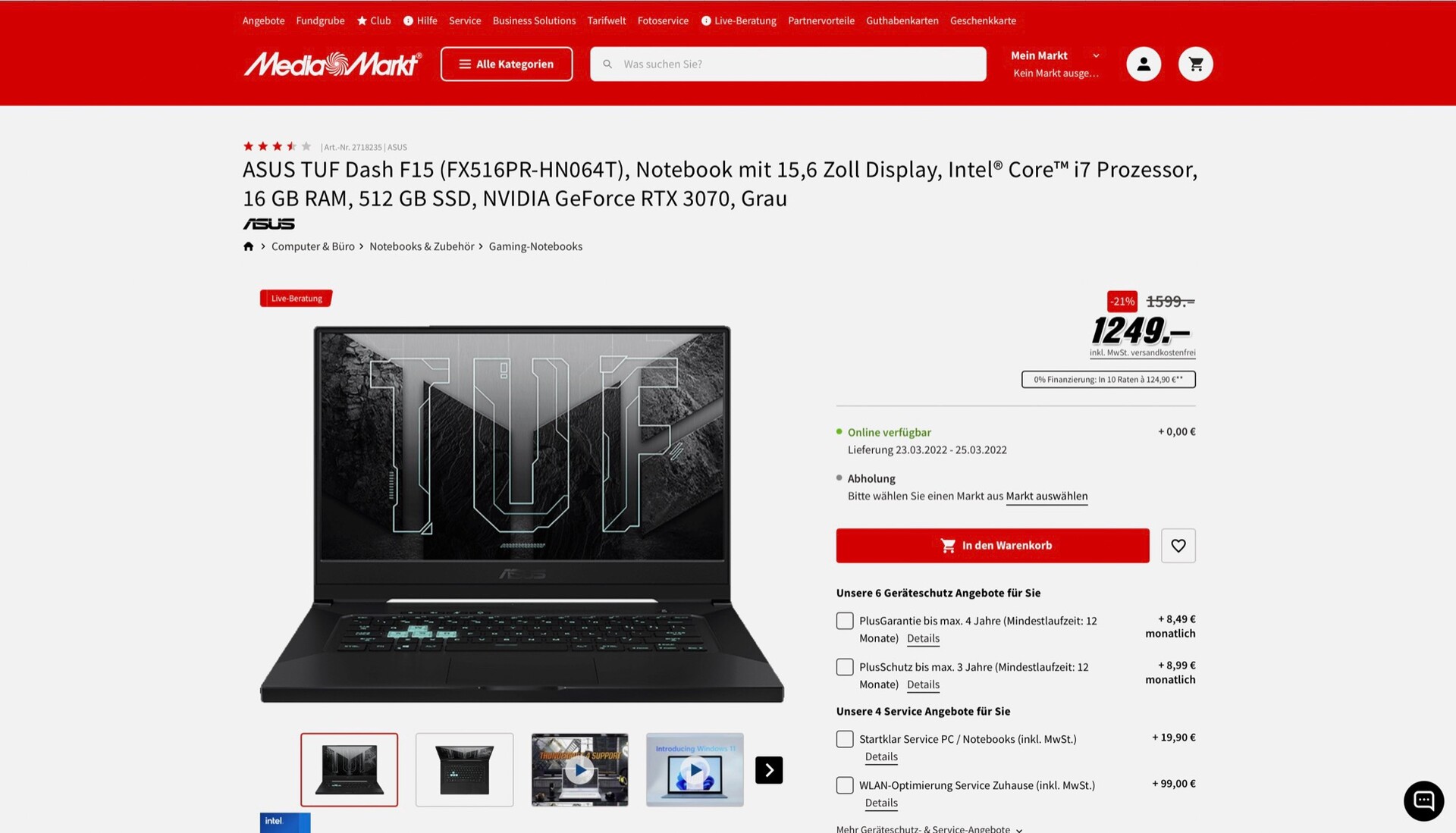 Das Asus TUF Gaming Dash F15 mit dieser Ausstattung war bis vor Kurzem nicht unter 1.599 Euro zu finden, aktuell bietet MediaMarkt das Gerät aber für nur 1.249 Euro an. Der Versand ist kostenlos. Dabei handelt es sich laut Preisvergleich um den Allzeit-Bestpreis für diese Variante des TUF Gaming Dash F15.