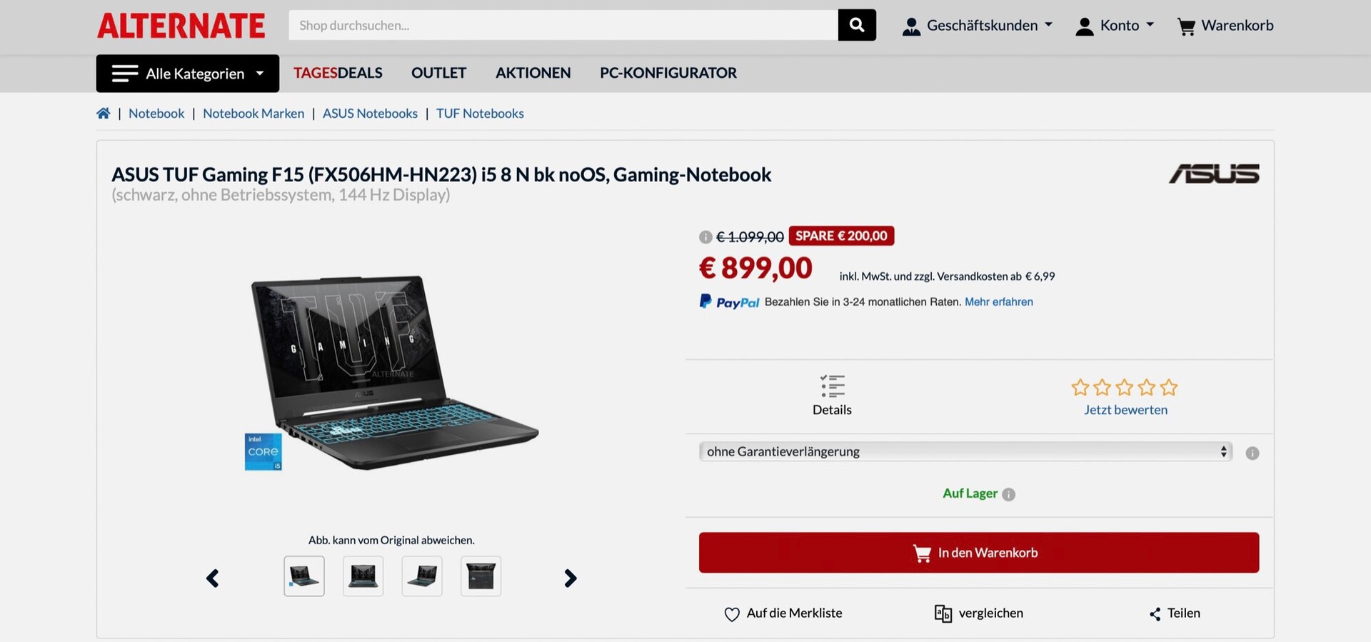 Das Asus TUF Gaming F15 kann aktuell bei Alternate für nur 899 Euro bestellt werden, und zwar mit einem Intel Core i5-11400H mit sechs Kernen, zwölf Threads und Taktfrequenzen von bis zu 4,5 GHz und mit einer Nvidia GeForce RTX 3060 Laptop-GPU mit 6 GB GDDR6-Grafikspeicher und Nvidias aktuellster Ampere-Architektur, wodurch der Grafikchip auch Deep Learning Super Sampling (DLSS), Raytracing und co. unterstützt.