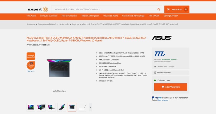 Das Asus Vivobook Pro 14 OLED kann aktuell bei Expert für nur 777 Euro bestellt werden, und zwar mit einem AMD Ryzen 7 5800H mit acht Prozessorkernen und Taktfrequenzen bis 4,4 GHz, mit 16 GB Arbeitsspeicher und mit einer 512 GB fassenden PCIe 3.0 SSD. Im Preisvergleich ist dieses Modell ansonsten nicht unter 978 Euro zu finden.