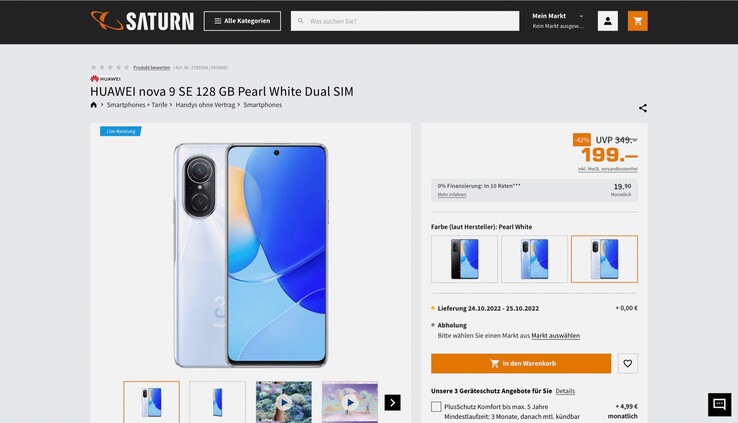 Das Huawei Nova 9 SE kann aktuell bei Saturn in der Farbe Pearl White für nur 199 Euro bestellt werden, der Versand ist kostenlos. Dabei handelt es sich um die Variante mit 8 GB Arbeitsspeicher und 128 GB Flash-Speicher, die in Deutschland für eine unverbindliche Preisempfehlung von 349 Euro auf den Markt gekommen ist, im Preisvergleich ist das Gerät ansonsten nicht unter 279 Euro zu finden.