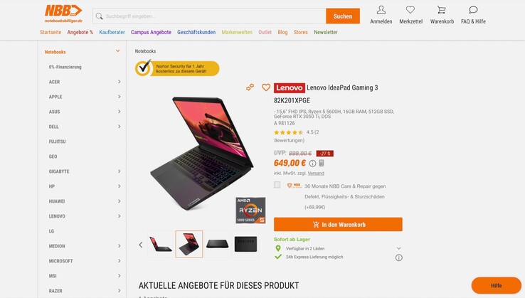 Das Lenovo IdeaPad Gaming 3 kann aktuell bei Notebooksbilliger für nur 649 Euro bestellt werden – laut Preisvergleich handelt es sich dabei um den Allzeit-Bestpreis für dieses Modell, das aktuell ansonsten nicht unter 900 Euro zu finden ist.