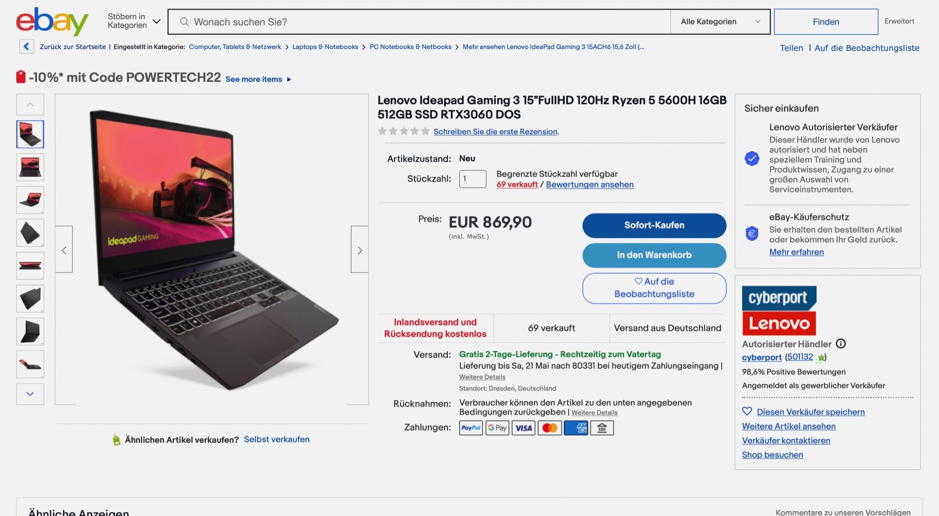 Das Lenovo IdeaPad Gaming 3 kann derzeit im offiziellen Cyberport-Shop auf ebay für nur 819,99 Euro bestellt werden. Um auf diesen Preis zu kommen, muss beim Bestellvorgang der Gutscheincode "POWERTECH22" angegeben werden. Das Modell im Angebot kostet beim Hersteller 1.049 Euro, im Preisvergleich ist das Gerät ansonsten nicht unter 899 Euro zu finden.