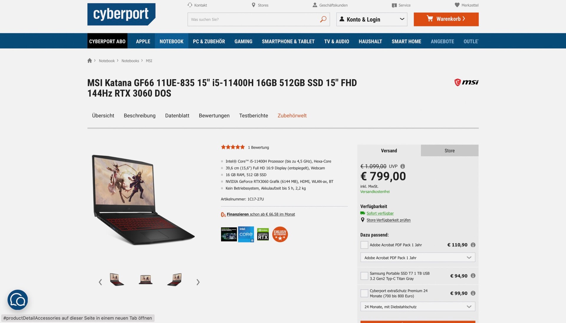 Das MSI Katana GF66 11UE wird derzeit bei Cyberport für nur 799 Euro angeboten, der Versand ist kostenlos. Wer sich für den Newsletter anmeldet, der kann weitere 5 Euro sparen. Dieses Modell wird regulär für eine unverbindliche Preisempfehlung von 1.099 Euro angeboten, und auch im Preisvergleich ist das Gerät ansonsten nicht unter dem Listenpreis zu finden.