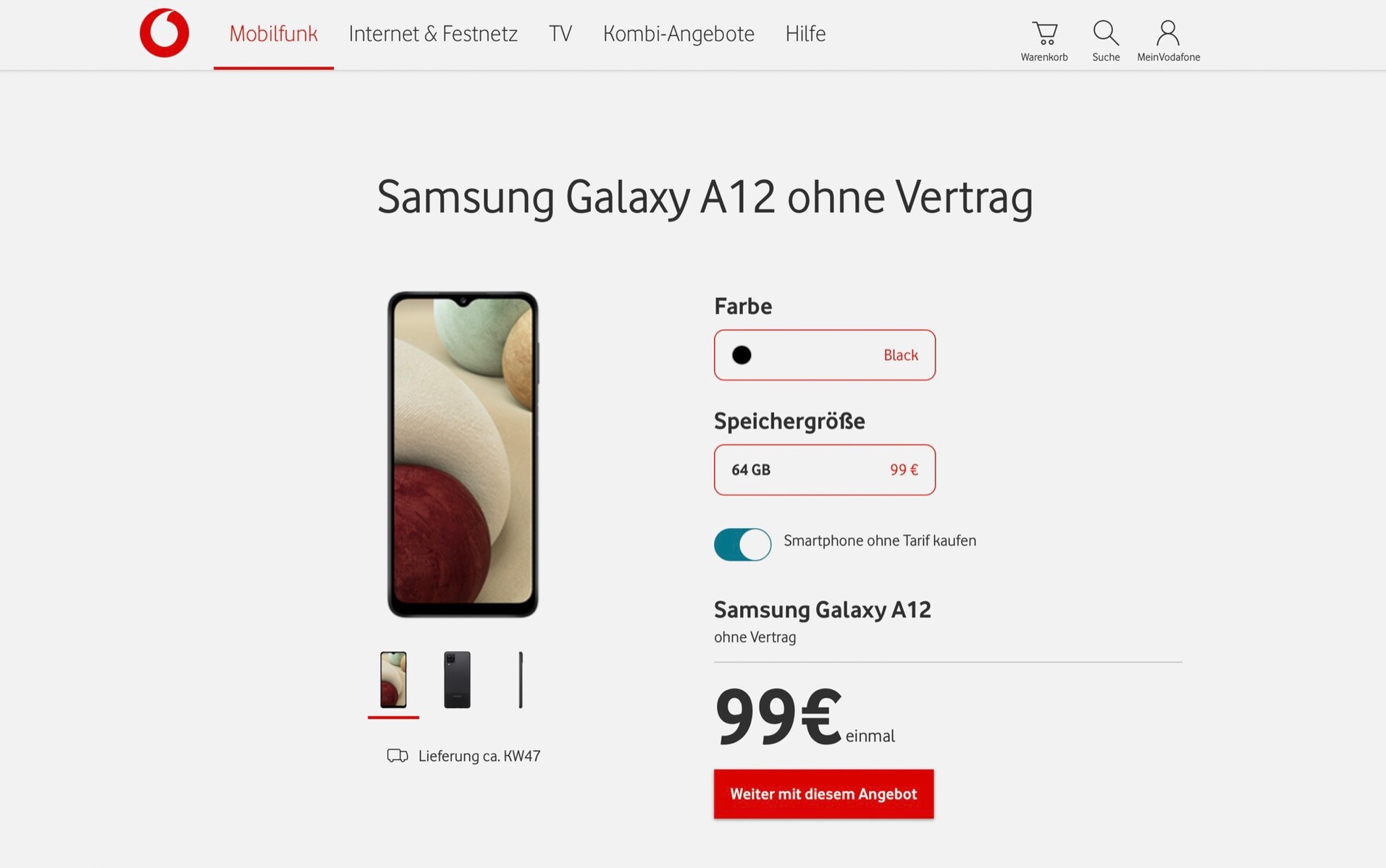 Nachdem das Xiaomi Redmi 10 aktuell schon zum Bestpreis von 129 Euro angeboten wird gibts jetzt ein noch günstigeres Smartphone von Samsung, denn Vodafone bietet das Galaxy A12 im Rahmen der Black Friday-Woche vertragsfrei für nur 99 Euro an. Das entspricht einem satten Rabatt im Vergleich zur unverbindlichen Preisempfehlung von 179 Euro, und auch im Preisvergleich findet man das Smartphone derzeit sonst nicht unter 162 Euro.