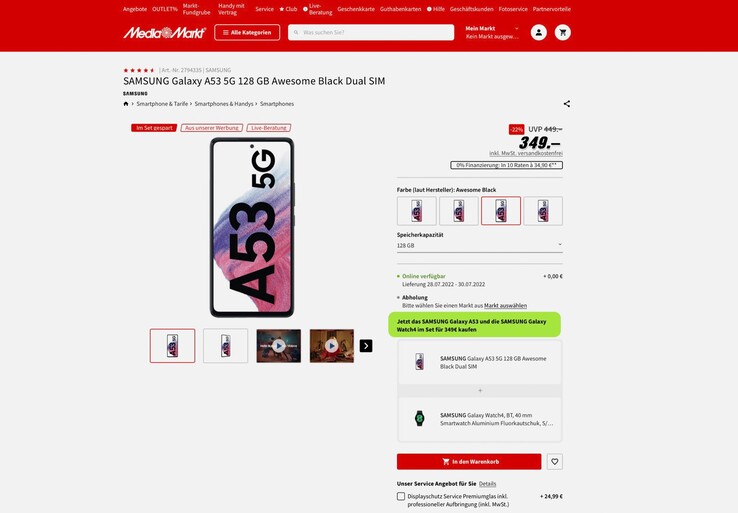 Das Smartphone war in den vergangenen Wochen ab und an auch ein paar Euro günstiger zu haben, die große Besonderheit dieser Aktion ist aber, dass Käufer eine Samsung Galaxy Watch4 (ca. 150 Euro auf Amazon) kostenlos dazu erhalten. Das Angebot gilt bis zum 7. August, oder solange der Vorrat reicht. MediaMarkt verschenkt die schwarze Galaxy Watch4 mit einem Durchmesser von 40 Millimetern, die im Preisvergleich mindestens 129 Euro kostet.