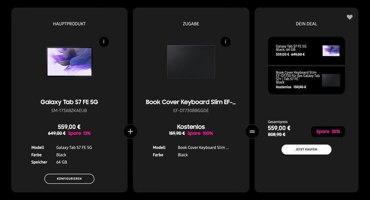 Samsung bietet derzeit ein interessantes Tablet-Bundle an: Das Galaxy Tab S7 FE 5G kann mit der Tastaturhülle über die Webseite des Herstellers für nur 559 Euro bestellt werden. Zum Vergleich: Das Tablet wird ansonsten bei Amazon zum Bestpreis von 519 Euro angeboten, die passende Tastaturhülle kostet 89 Euro, man spart also immerhin 49 Euro.