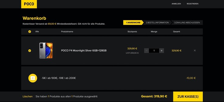 Das Poco F4 mit 6 GB Arbeitsspeicher und 128 GB Flash-Speicher kann aktuell im offiziellen Onlineshop von Poco für nur 314,90 Euro bestellt werden. Um auf diesen Preis zu kommen, muss das Smartphone in den Warenkorb gelegt werden, wo der angezeigte Preis von 329,90 Euro automatisch um 10 Euro reduziert wird. Mit dem Gutscheincode "POCO5" können Neukunden weitere 5 Euro sparen, wenn die Bestellung über die Poco Store App durchgeführt wird.