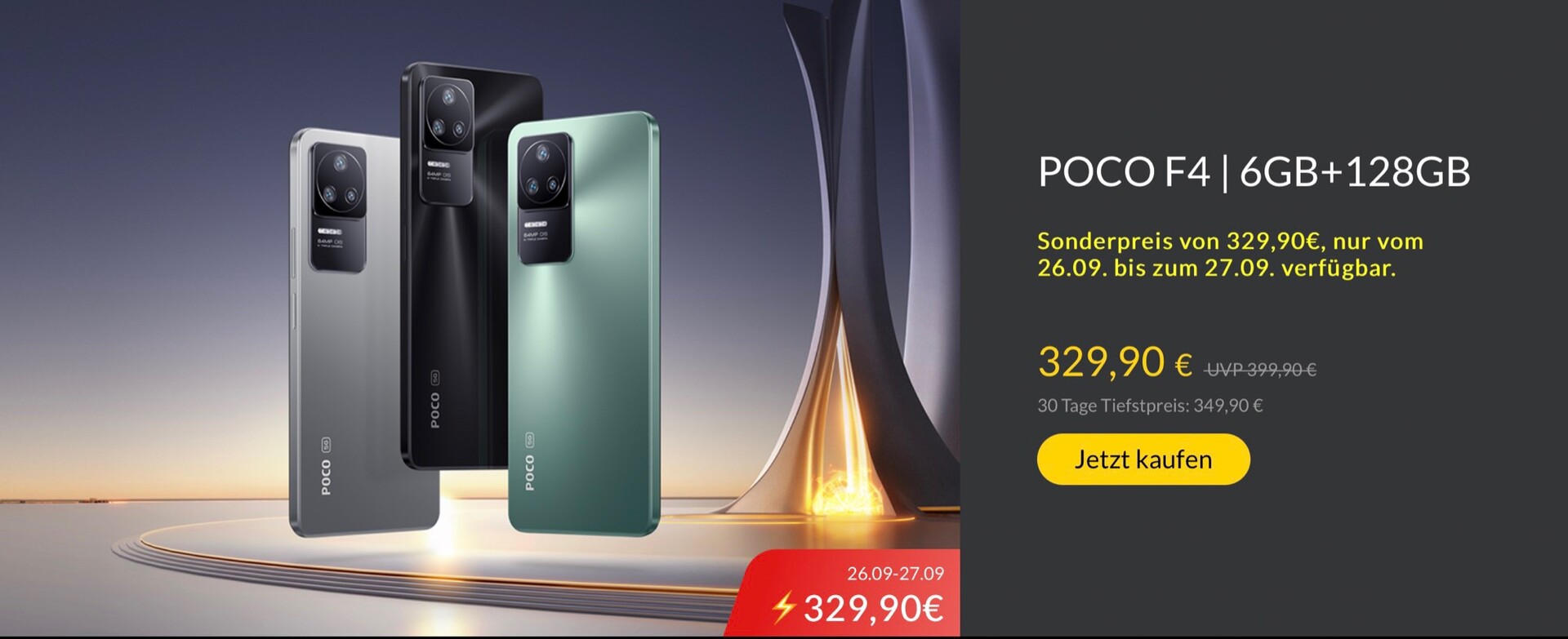 Diese Aktion gilt ab sofort bis zum Dienstag, dem 26. September, oder aber solange der Vorrat reicht. Im Preisvergleich ist dasselbe Modell aktuell nicht unter 365 Euro zu finden, sodass es sich dabei um den absoluten Bestpreis für das Poco F4 handelt. Vor dem Kauf lohnt es sich, unseren ausführlichen Test des Poco F4 zu lesen, denn das Mittelklasse-Smartphone bietet einige Features, die man in diesem Preisbereich nur selten findet.