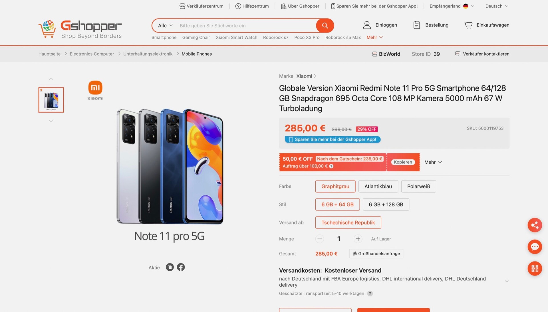 Das Xiaomi Redmi Note 11 Pro 5G kann aktuell bei Gshopper für nur 235 Euro bestellt werden. Um auf diesen Preis zu kommen, muss der Gutscheincode "ACF498133E7C" angegeben werden, der den angezeigten Preis um 50 Euro reduziert. Zu diesem Preis gibts das Modell mit 6 GB Arbeitsspeicher und 64 GB Flash-Speicher.