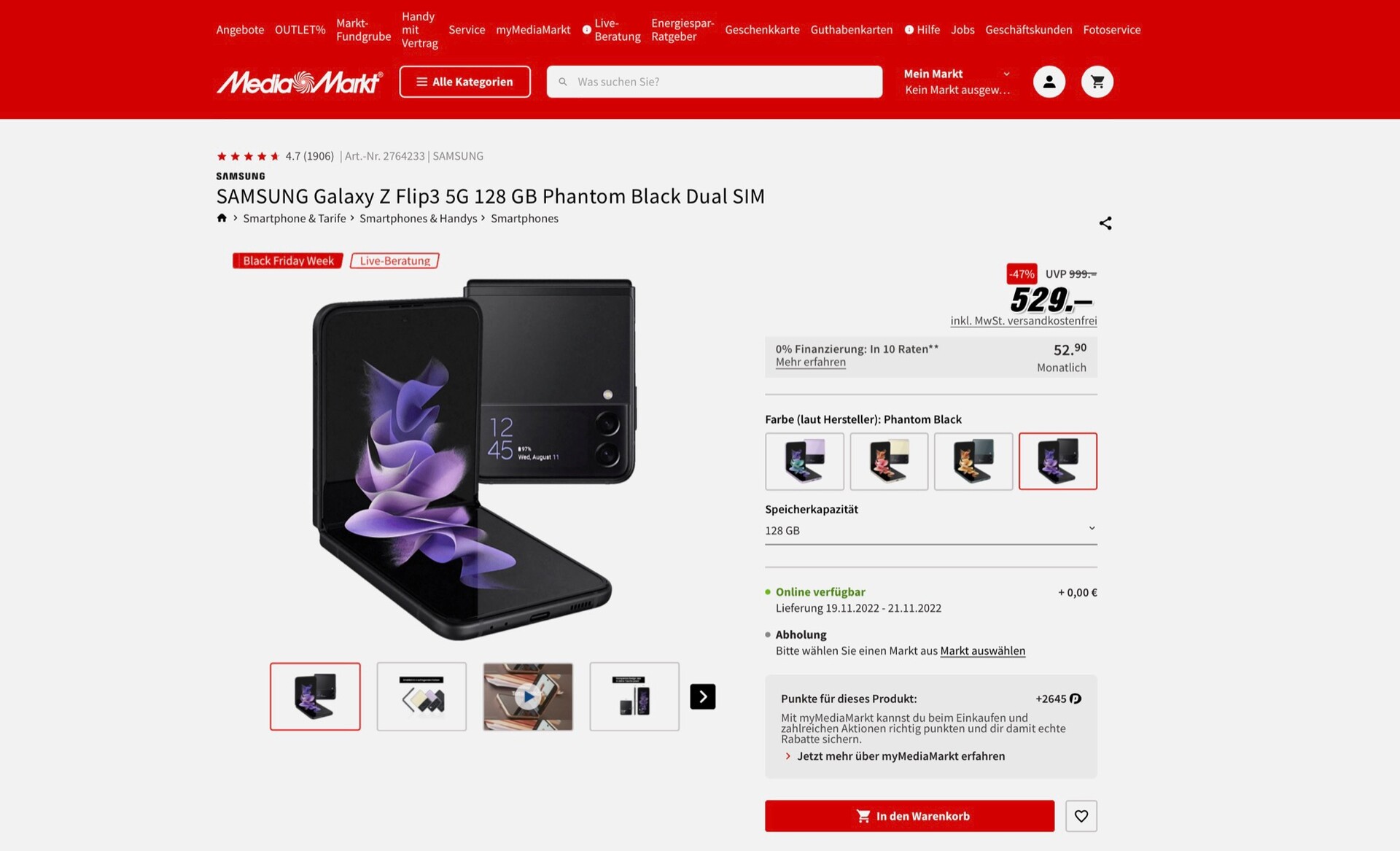 Das Samsung Galaxy Z Flip3 5G kann aktuell bei MediaMarkt in den Farben Phantom Green und Phantom Black für nur 529 Euro bestellt werden, der Versand ist kostenlos. Das Gerät ist im Preisvergleich ansonsten nicht unter 589 Euro zu finden, das neuere Galaxy Z Flip4 5G kostet mindestens 697 Euro.
