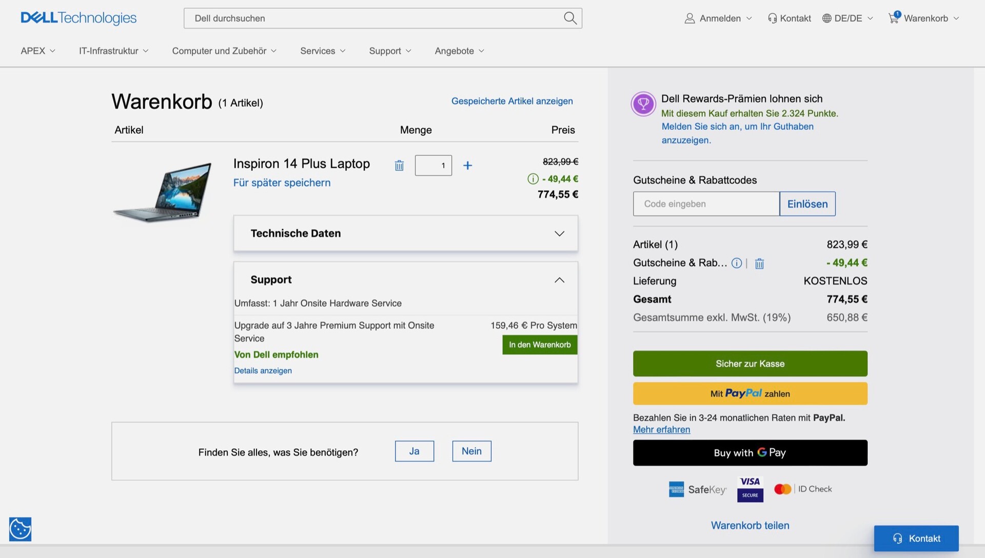 Das Dell Inspiron 14 Plus kann derzeit direkt bei Dell für nur 774,55 Euro bestellt werden, solange der Gutscheincode "6InspXSavingsUnited" im Warenkorb angegeben wird. Im Preisvergleich ist das Inspiron 14 Plus nicht unter 1.196 Euro zu finden, allerdings ist am freien Markt nur das Modell mit GeForce RTX 3050 Laptop-GPU erhältlich, während sich das Modell im Angebot mit der Intel Iris Xe Graphics G7 begnügen muss.