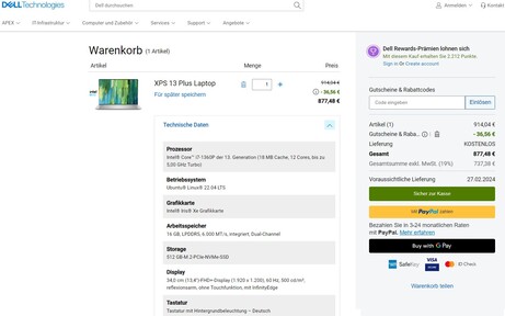 Aktuell erhält man direkt bei Dell das XPS 13 Plus (2023) Multimedia-Notebook mit 16 GB RAM, Core-i7-Prozessor und 500 cd/m² hellem Display. Dank des Gutscheincodes "DELLSAVE4" kommt man auf einen Deal-Preis von günstigen 877 Euro, nachdem man die Coire-i7-Variante und Ubuntu Linux 22.04 LTS angewählt hat.