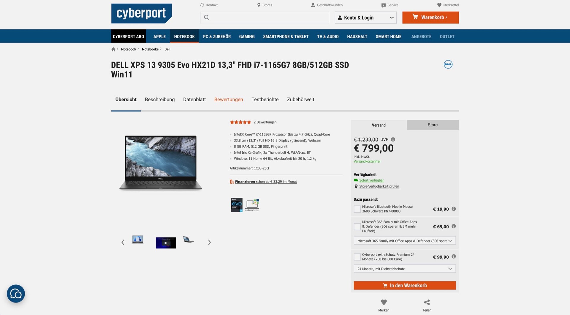 Das Dell XPS 13 9305 kann derzeit bei Cyberport für nur 799 Euro bestellt werden, der Versand ist kostenlos. Im Preisvergleich ist das Modell im Angebot ansonsten nicht unter 1.108 Euro zu finden, der Listenpreis liegt bei 1.299 Euro.