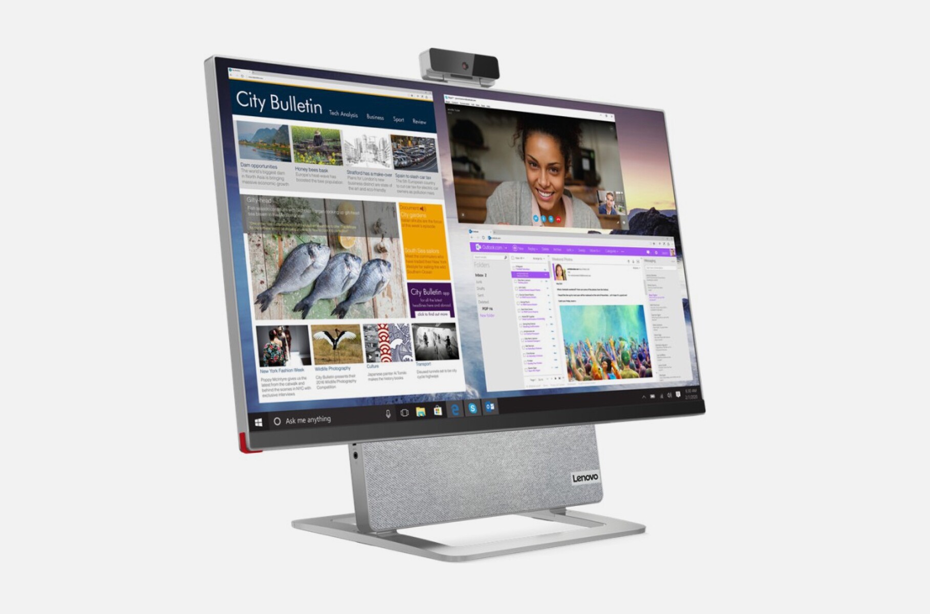 Dazu gibts 16 GB DDR4-3.200-Arbeitsspeicher und eine 1 TB fassende SSD. Lenovo verbaut 2 x 5 Watt Stereo-Lautsprecher. Der Standfuß ermöglicht es, das Display auf Wunsch ins Hochformat zu drehen. Im Lieferumfang findet man neben dem All-in-One-Computer und der abnehmbaren Webcam auch eine kabellose Tastatur und Maus.