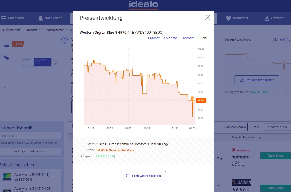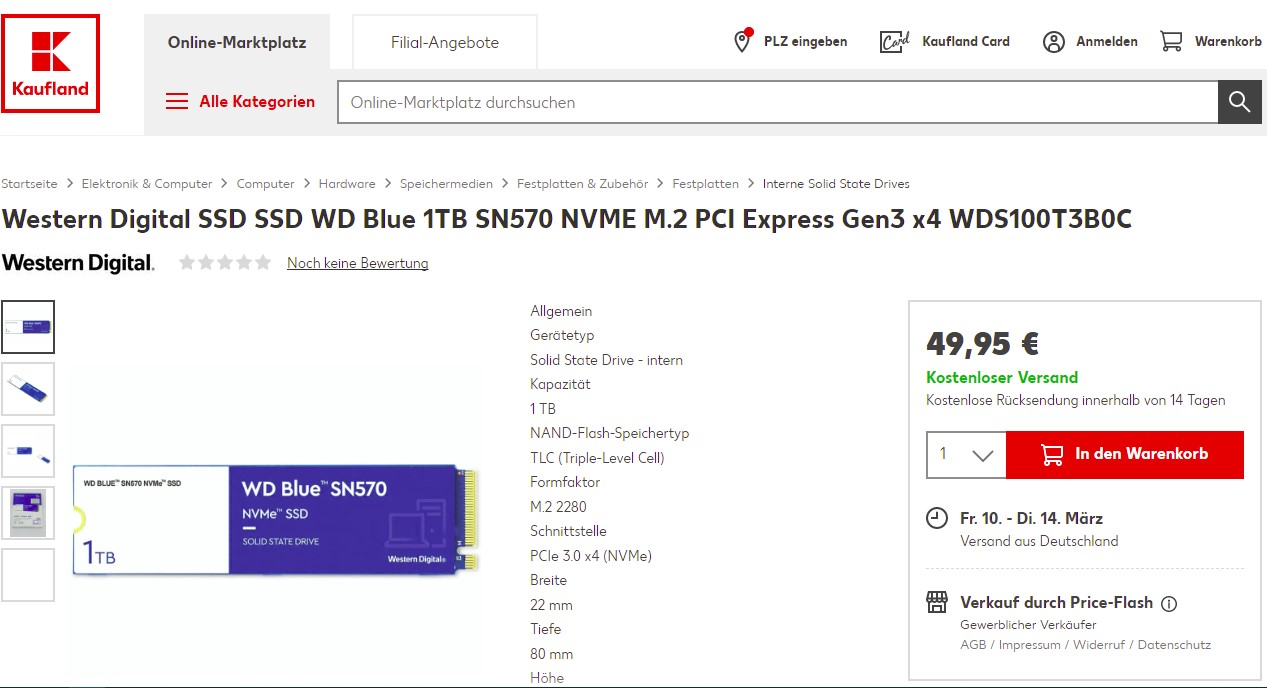 Wer das Angebot vom Februar zur WD SN570 verpasst hat, bekommt die 1TB-NVMe-SSD aktuell wieder für unter 50 Euro, über Kaufland durch den Verkäufer "Price-Flash" dieses mal sogar versandkostenfrei, was den Top-Deal nochmals besser macht. Im Vergleich zum Durchschnittspreis der letzten drei Monate ergibt sich sogar eine Ersparnis von 16 Prozent bzw. von knapp 10 Euro.