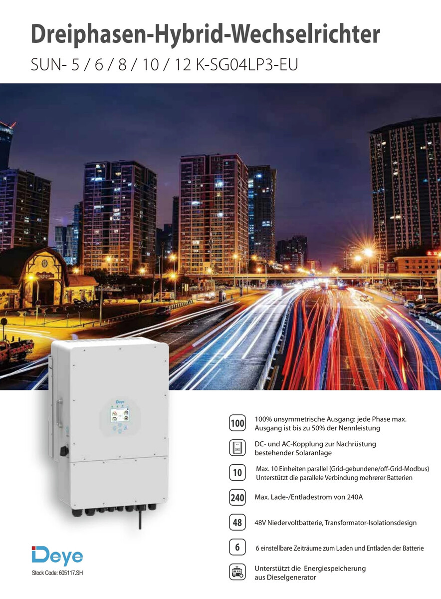 Dreiphasige Wechselrichter haben im Vergleich zu einphasigen Wechselrichtern eine höhere Spannung und damit eine höhere Leistung und sind robuster. Darüber hinaus kann der Wechselrichter dank einer Anbindung ans WLAN auch vom Handy aus überwacht werden und verfügt zudem über ein Touch-Display für eine einfache Steuerung.