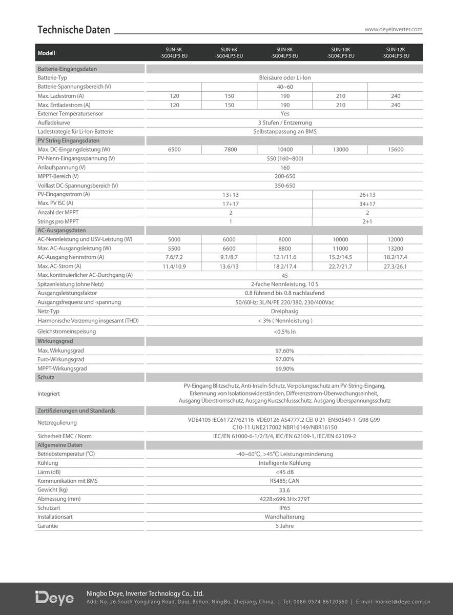 Der dreiphasige Hybrid-Wechselrichter von Deye wird derzeit für günstige 2.599 Euro angeboten und kann zuzüglich 70 Euro Versandkosten auch verschickt werden. Der Hybrid-Wechselrichter Deye SUN-12K-SG04LP3-EU für LV-Batterien hat einen Betriebsspannungsbereich von 40 bis 60 Volt und wandelt den von den Solarmodulen erzeugten Gleichstrom in Wechselstrom um, der dann in das Hausnetz eingespeist werden kann. Zusätzlich kann der Hybrid-Wechselrichter einen Teil des Solarstroms zwischenspeichern.