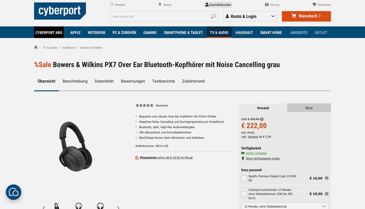 Wer den Kopfhörer nicht in einem Store abholen möchte, der bezahlt zusätzlich 5,99 Euro Versand nach Deutschland, oder aber 8,99 Euro Versand nach Österreich. Selbst mit den Versandkosten bietet Cyberport die Bowers & Wilkins PX7 aber zum Allzeit-Bestpreis an, laut Preisvergleich ist derselbe Kopfhörer ansonsten nicht unter 281 Euro zu finden.