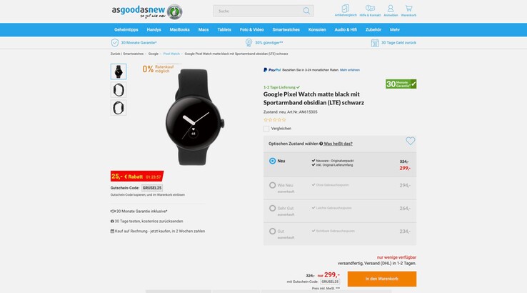 Die Google Pixel Watch mit integriertem LTE-Modem wird aktuell bei Asgoodasnew zum Preis von 299 Euro angeboten, solange der Gutscheincode "GRUSEL25" angegeben wird. Der Promo-Code gilt nur noch für kurze Zeit, anschließend steigt der Preis auf 324 Euro – auch das ist noch ein Bestpreis für die Smartwatch. Das Modell ohne Modem ist nur 10 Euro günstiger zu bekommen, obwohl der Listenpreis dieses Modells mit 379 Euro ganze 50 Euro niedriger als bei der 4G-Variante ausfällt.