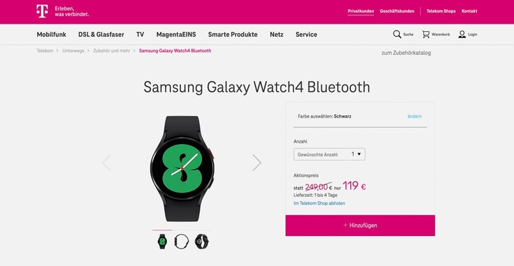 Die Samsung Galaxy Watch4 mit einem Durchmesser von 44 Millimetern in der Farbe Schwarz kann aktuell bei der Telekom für nur 119 Euro bestellt werden, der Versand ist kostenlos. Im Preisvergleich ist die Smartwatch derzeit nicht unter 137 Euro zu finden.