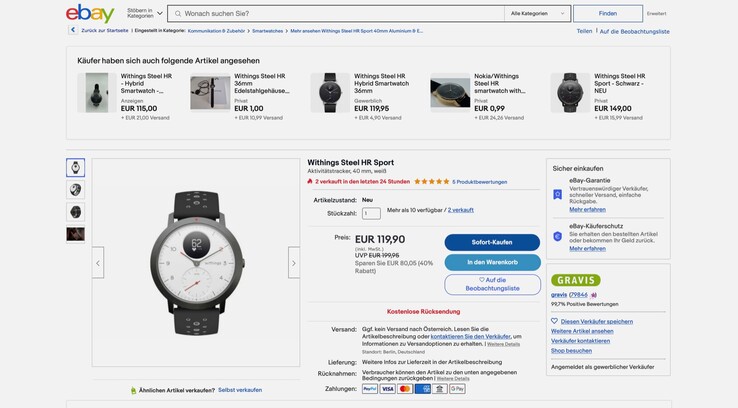 Die 40 Millimeter Withings Steel HR kann aktuell im ebay-Shop von Gravis für nur 119,90 Euro bestellt werden. Über den Onlineshop von Gravis wird die Hybrid-Smartwatch zum gleichen Preis angeboten, allerdings ist der Versand bei einer Bestellung über ebay kostenlos, bei Gravis werden 5,99 Euro fällig. Regulär kostet die Uhr 179,95 Euro, im Preisvergleich ist die Smartwatch ansonsten nicht unter 165 Euro zu finden.