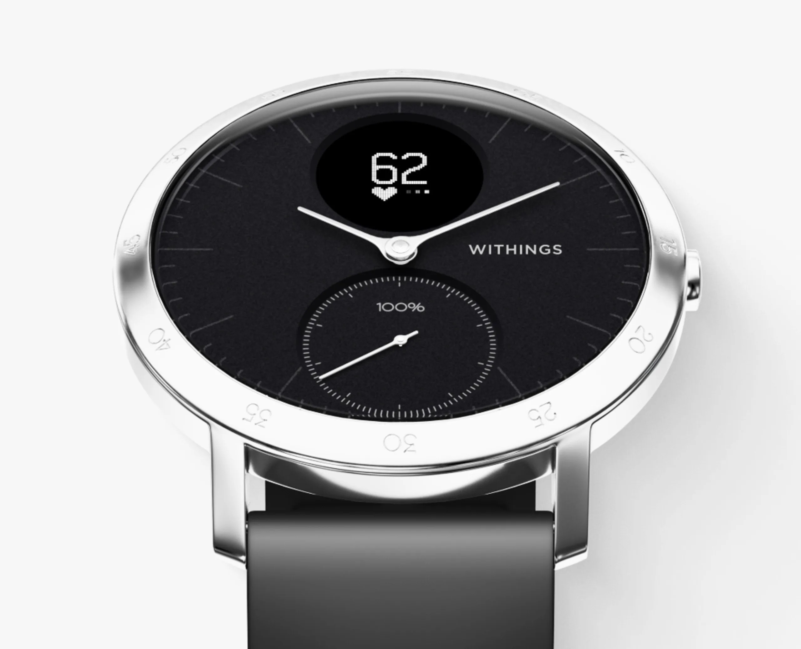 Die Withings Steel HR kombiniert das Design einer traditionellen Armbanduhr samt schlichtem, analogen Zifferblatt mit diversen Sensoren und mit einem kleinen, runden Display, auf dem unter anderem die aktuelle Herzfrequenz oder auch eingehende Benachrichtigungen angezeigt werden können. Durch das kleine Display kann Withings eine Akkulaufzeit von bis zu 25 Tagen erzielen, sodass die Hybrid-Smartwatch nur etwas öfter als einmal pro Monat aufgeladen werden muss.