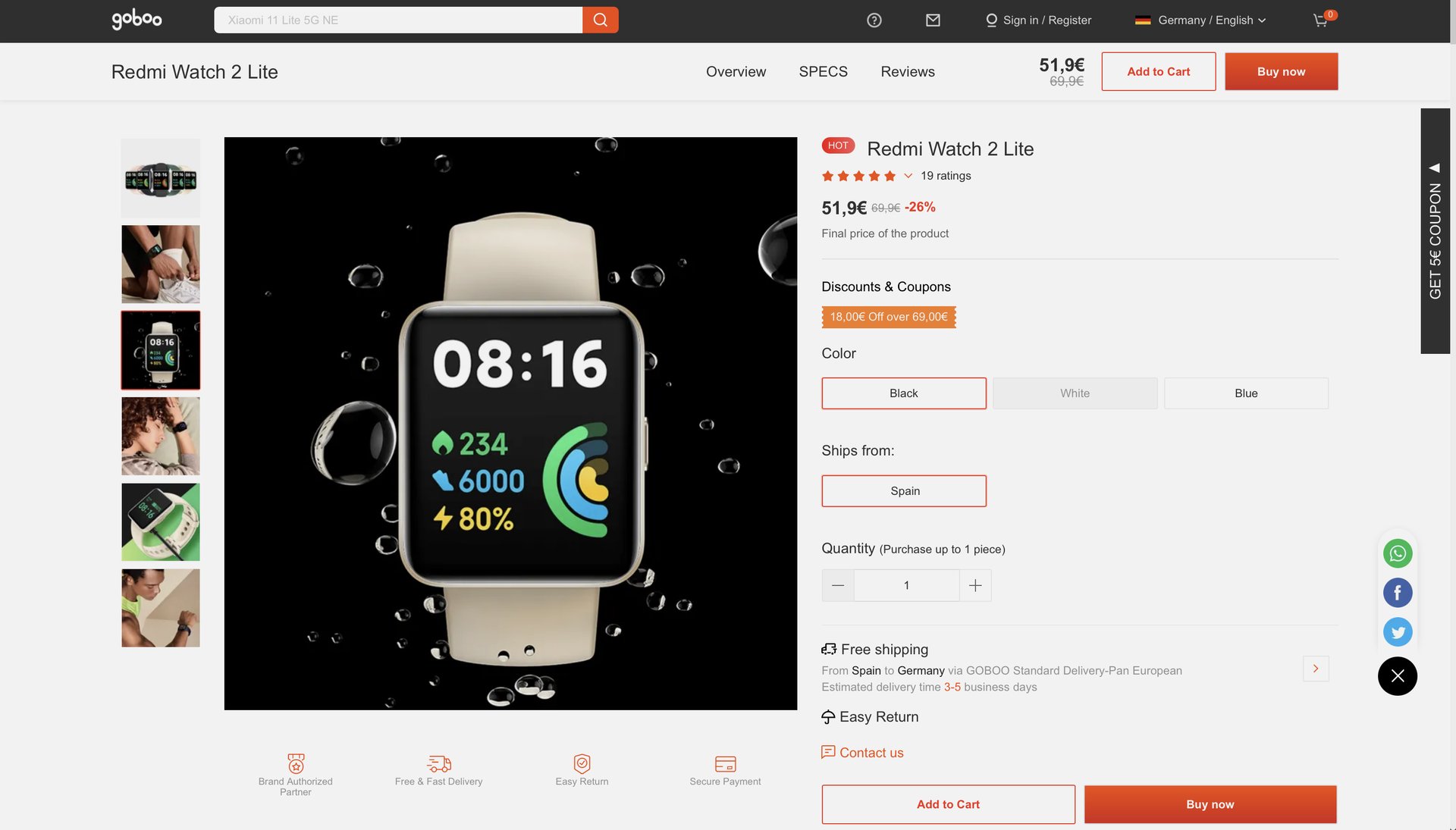 Die Redmi Watch 2 Lite kam in Deutschland erst im Dezember für einen Listenpreis von 69,99 Euro auf den Markt, im Preisvergleich war die Smartwatch bislang nie unter 58 Euro zu finden – bis jetzt. Denn Goboo bietet die Uhr aktuell für nur 51,90 Euro an, mit kostenlosem Versand aus Spanien, sodass keine weiteren Kosten für Zölle oder Steuern anfallen. Die Uhr ist wahlweise in Schwarz oder in Blau erhältlich.