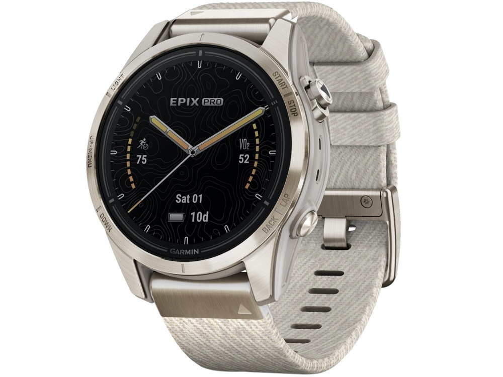 Der aus München stammende Händler UhrenDirekt verkauft aktuell nämlich die hübsche goldene Ausführung der Epix Pro 2 Sapphire für 759 Euro inklusive Versand. Dieser Deal-Preis kommt durch die Kombination des Gutscheincodes "ud-exklusiv-2324" sowie dem zusätzlichen 5% Rabatt durch Zahlung per Vorkasse zustande. Der Gehäusedurchmesser der Garmin-Smartwatch beträgt schlanke 42mm, im Lieferumfang ist neben dem beigen Armband aus Nylon außerdem ein ähnlich gefärbtes Silikon-Armband für die Epix Pro 2 enthalten.