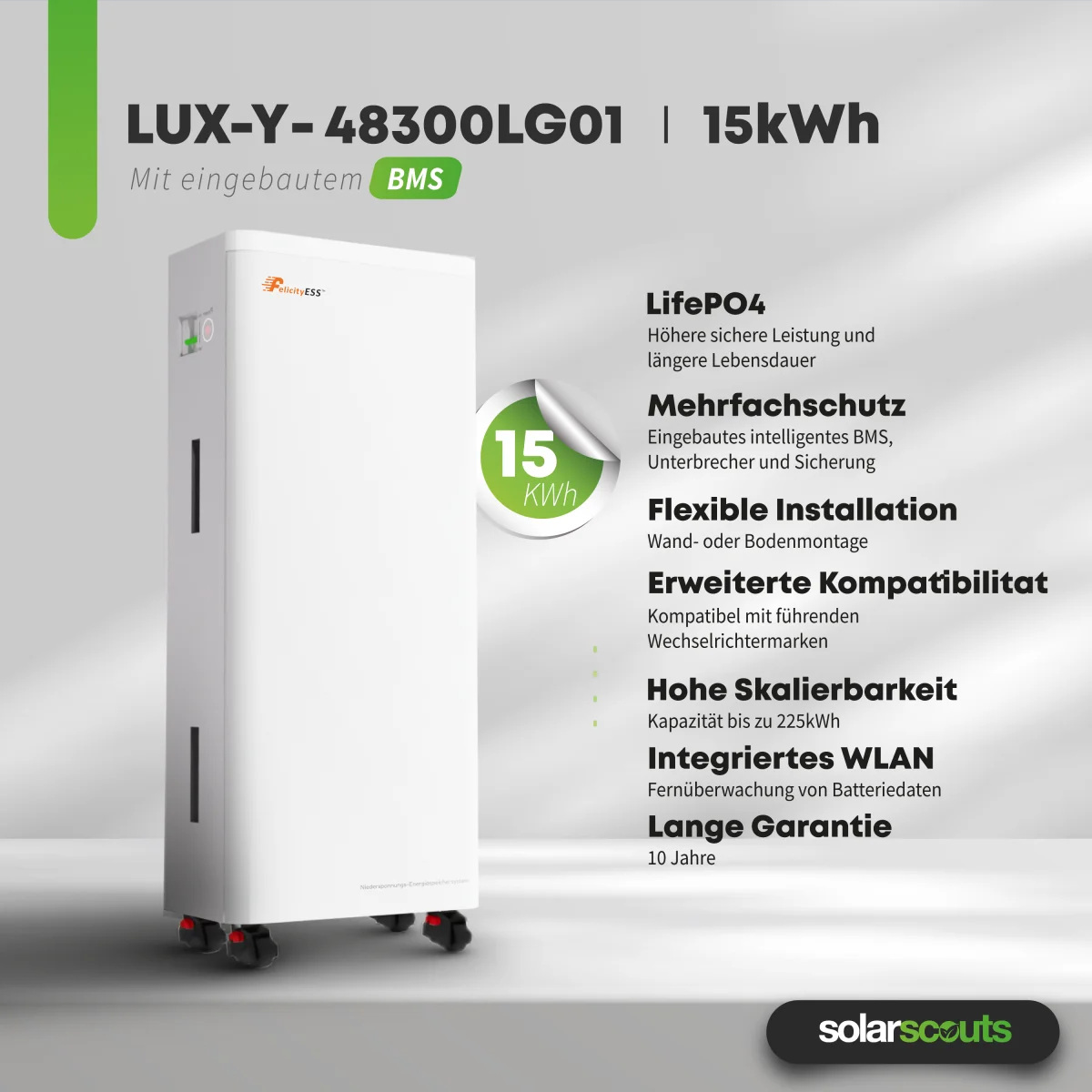 Konkret handelt es sich um das Modell LUX-Y-48300LG01 mit einer Kapazität von 15 kWh sowie einer nominalen Spannung von 51,2 V und einem Spannungsbereich von 44,8–57,6 V. Es handelt sich um ein Low-Voltage-System. Eine integrierte Schutzschaltung schützt vor Überladung und Kurzschlüssen, außerdem ist ein Feuerlöschgel vorhanden. Die LiFePO4-Akkuzellen (Lithium-Ionen-Akku) sorgen zudem für eine lange Lebensdauer von ≥ 6.000 Zyklen.