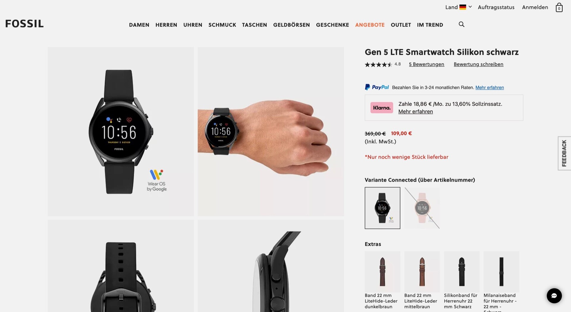 Die Fossil Gen 5 LTE Smartwatch (FTW40533) mit einem Durchmesser von 45 Millimeter, einem bis 3 ATM wasserfesten Gehäuse aus Edelstahl und einem Sportarmband aus Silikon kann derzeit im Onlineshop von Fossil für nur 109 Euro bestellt werden, allerdings nur solange der Vorrat reicht. Im Preisvergleich kostet dieses Modell mindestens 179 Euro.