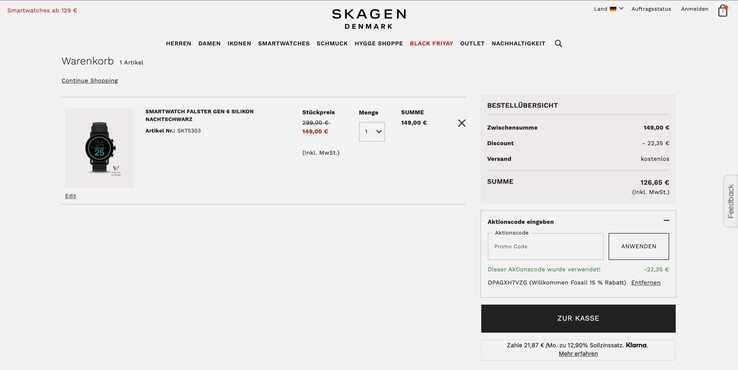 Die Skagen Falster Gen 6 Smartwatch kann derzeit über die Webseite von Skagen für nur 126,65 Euro bestellt werden, und zwar in unterschiedlichen Farben und wahlweise mit einem Leder- oder Silikonarmband. Auch die schicke, blaue "Tide Ocean"-Version ist zu diesem Preis zu bekommen. Die Varianten mit Edelstahl-Armbändern kosten im heutigen Black-Friday-Sale 152,15 Euro. Der Versand ist jeweils kostenlos.