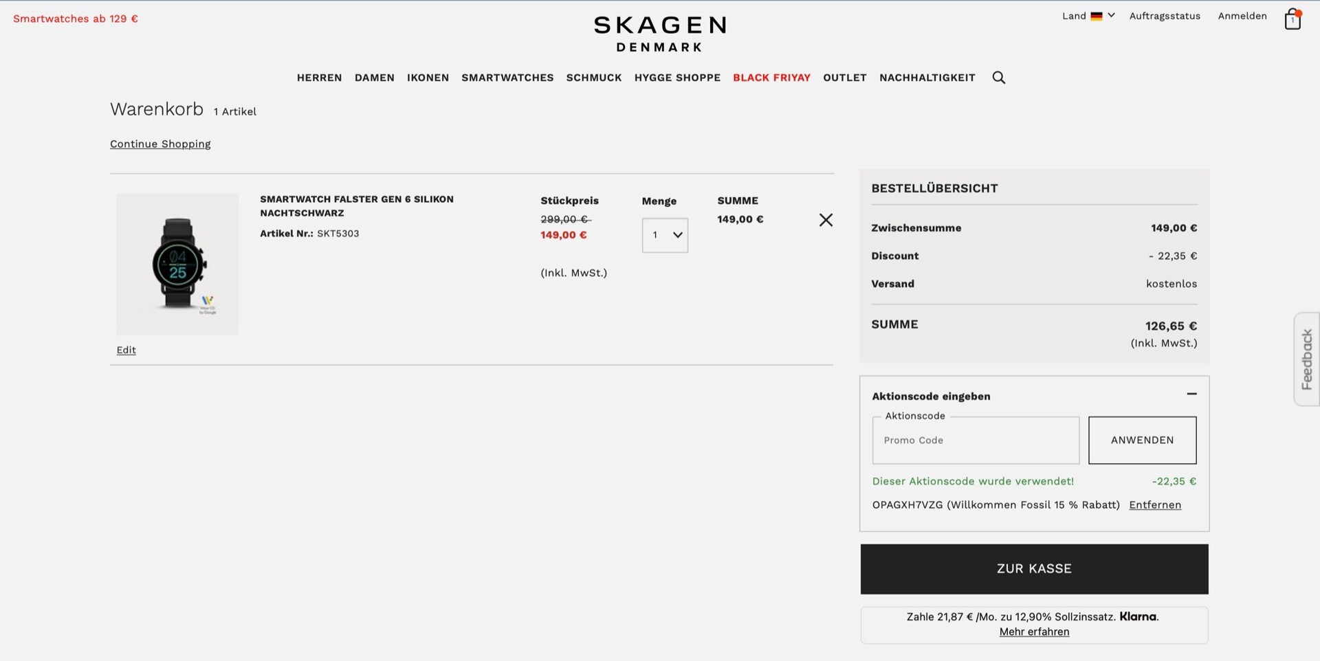 Um auf die angegebenen Preise zu kommen, muss eine E-Mail-Adresse im entsprechenden Pop-up-Fenster angegeben werden, woraufhin die Webseite einen Gutscheincode anzeigt, der den Preis im Warenkorb um weitere 15 Prozent reduziert. Im Preisvergleich war die Falster Gen 6 bis Mitte November nicht unter 215 Euro zu finden, aktuell liegt der nächste Vergleichspreis bei 149 Euro.