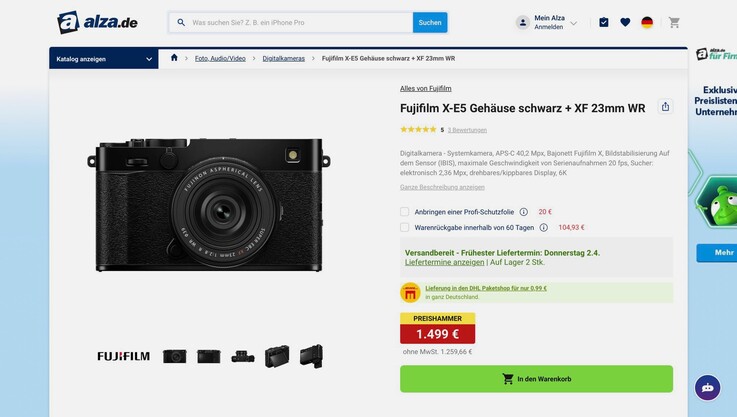 Die Fujifilm X-E5 wurde im vergangenen Juni offiziell vorgestellt. Die Kamera wurde zum Launch wahlweise ohne Objektiv für 1.549 Euro angeboten, oder aber in einem Kit mit einem sehr kompakten 23 mm f/2.8 Objektiv für 1.799 Euro. Eben dieses Kit wird derzeit bei Alza für nur 1.499 Euro angeboten.
