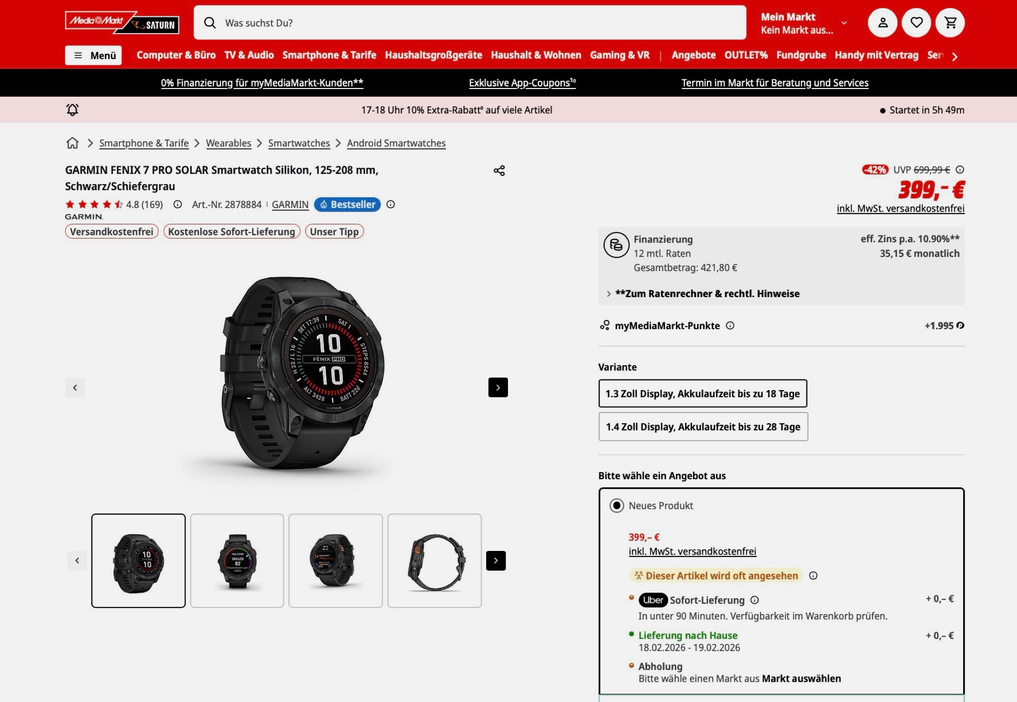 Die Garmin Fenix 7 Pro Solar wird aktuell sowohl bei MediaMarkt als auch bei Saturn für nur 399 Euro angeboten. Laut Preisvergleich handelt es sich dabei um den Bestpreis für die Smartwatch, die bis gestern nicht unter 473 Euro zu bekommen war, aktuell liegt der nächste Vergleichspreis bei 451 Euro.