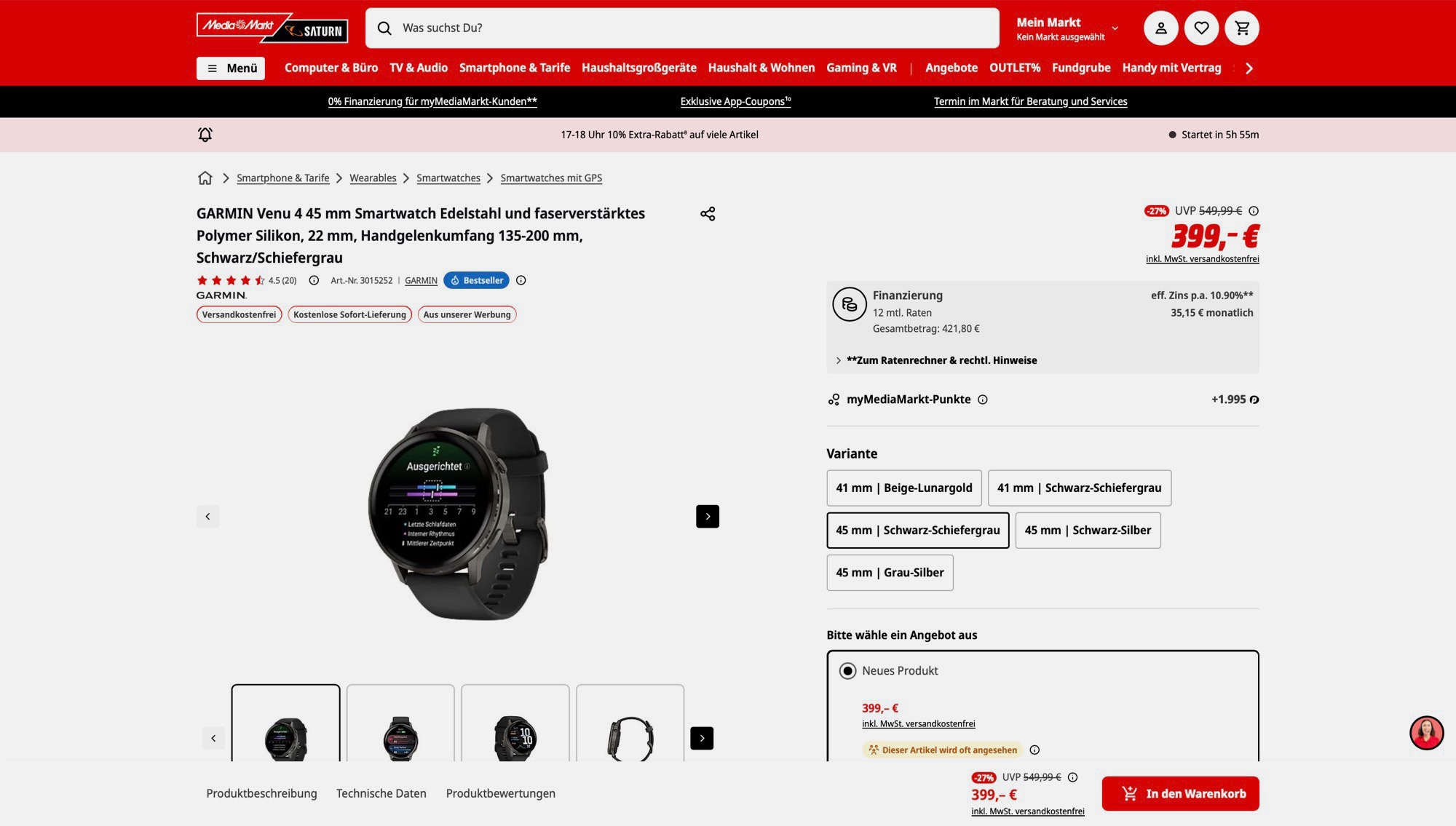 Die Garmin Venu 4 gibts aktuell sowohl auf Amazon als auch bei MediaMarkt für nur 399 Euro, und zwar wahlweise mit einem Gehäuse-Durchmesser von 41 oder 45 Millimeter. Das kleinere Modell wird in den Farben Silber und Gold zum Aktionspreis angeboten, die größere Version in Silber und Schwarz.