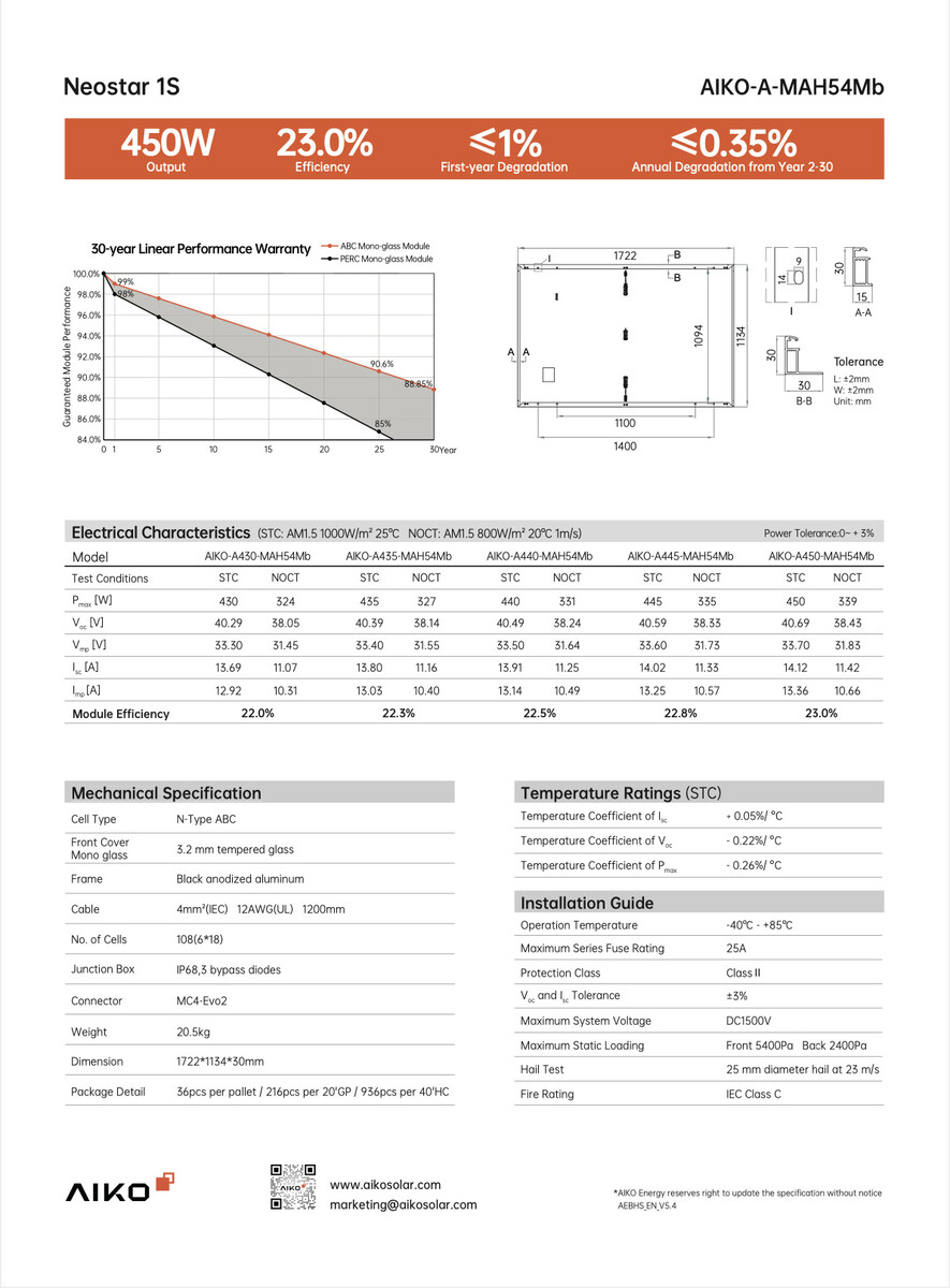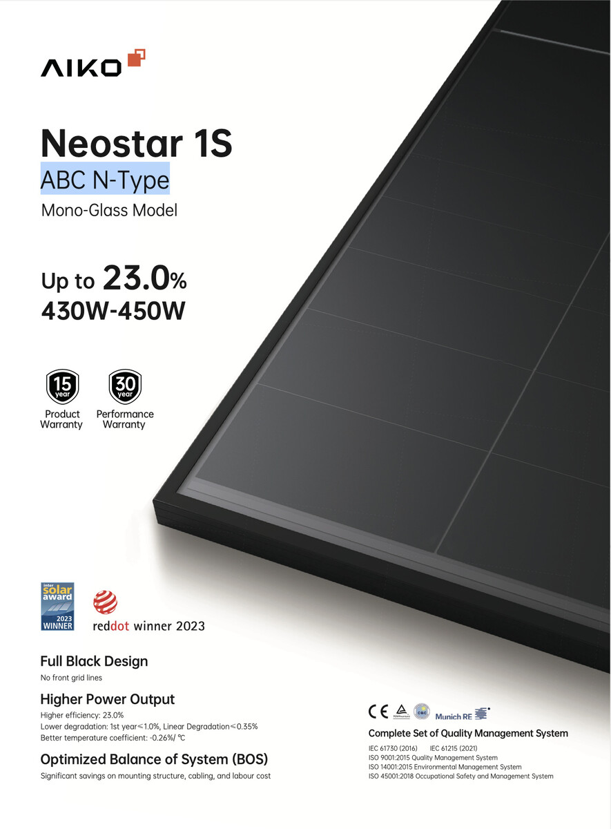Bei den 22 gelieferten Modulen handelt es sich um das Modell Aiko A445-MAH54Mb/445Wp Neostar 1S mit relativ moderner ABC- sowie N-Typ-Technologie in Full Black. Die Spitzenleistung beträgt jeweils 445 Wp bei einem Modulwirkungsgrad von 22,5 % sowie einer geringen Leistungsdegradation im ersten Jahr ≤ 1,0 % und einer linearen Degradation ≤ 0,35 % in den Folgejahren. Die Garantiezeit beträgt 25 Jahre für das Produkt und 30 Jahre für die Leistung. Es handelt sich bei den Modulen um eine etwas ältere Generation, die neueren Solarpanels von Aiko bieten beispielsweise den Vorteil der partiellen Verschattungsoptimierung.