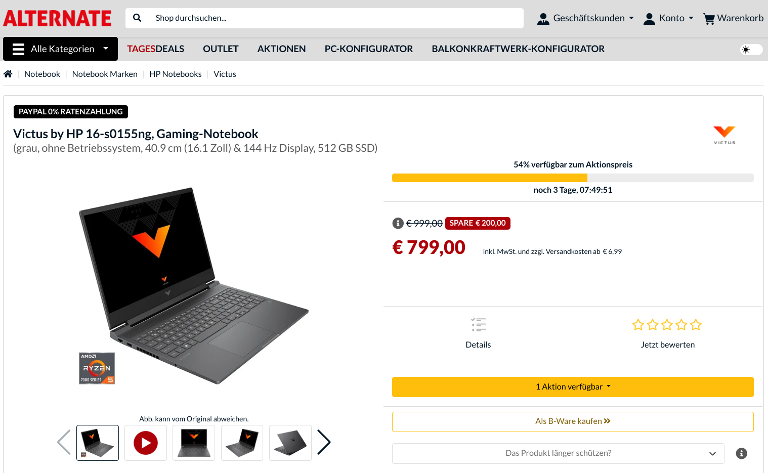 Bei Alternate erhält man gerade den sehr günstigen Gaming-Laptop HP Victus 16 für nur 799 Euro. Ausgestattet ist der 16-Zöller mit einem Sechskern-Prozessor AMD Ryzen 5 7640HS und einer Nvidia GeForce RTX 4060 mit satter 120-Watt-TGP. Laut dem Preisvergleichsdienst Idealo gab es den Gaming-Laptop nie unter 799 Euro zu haben bzw. zuletzt vor über einem Monat zum gleichen Preis.