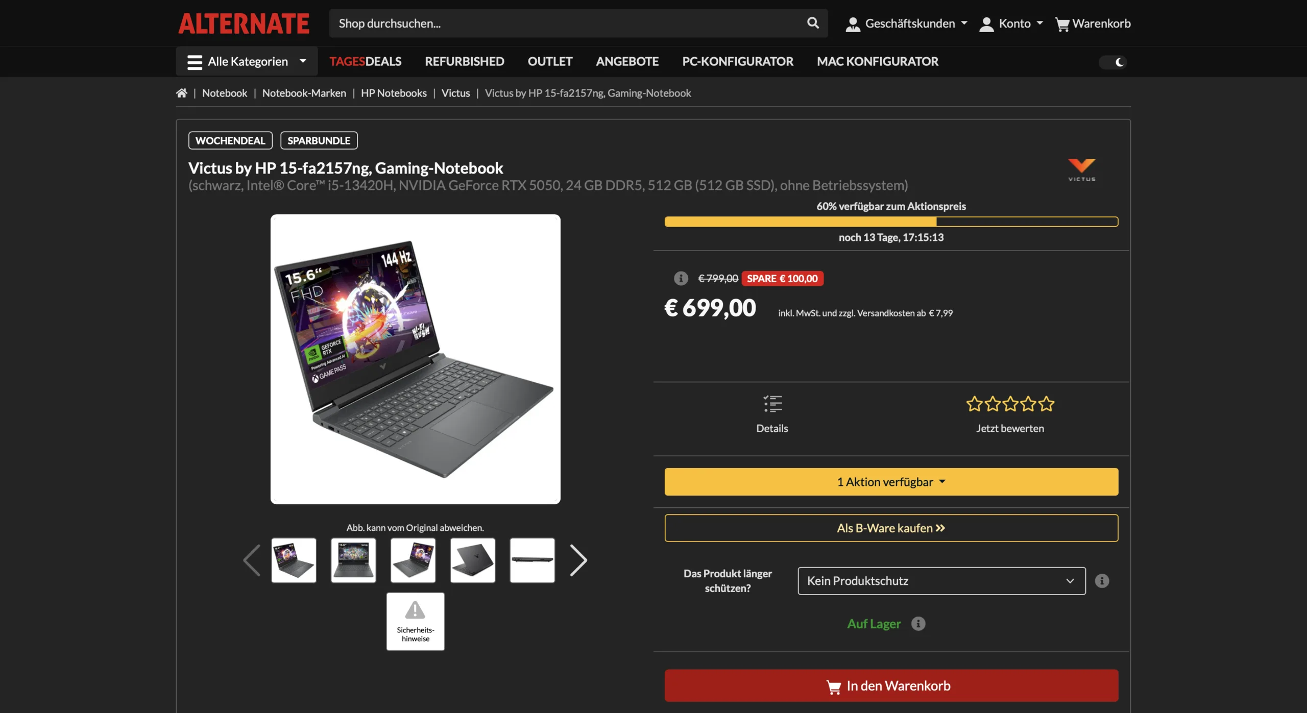 Das HP Victus 15 (15-fa2157ng) wird derzeit bei Alternate für nur 699 Euro zuzüglich 7,99 Euro Versand angeboten. Laut Preisvergleich ist dasselbe Modell aktuell ansonsten nicht unter 953 Euro zu bekommen, und wurde auch nie zuvor für weniger als 799 Euro angeboten.