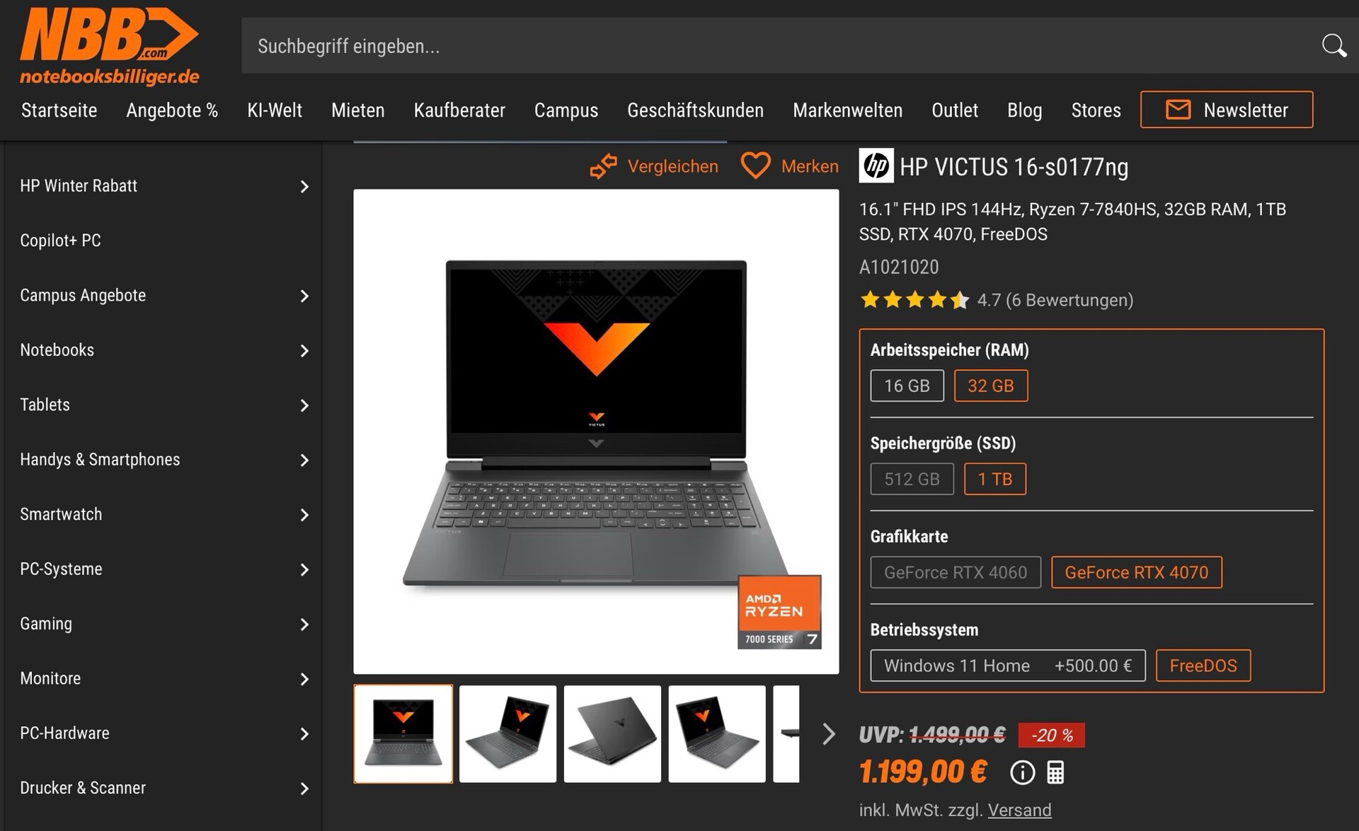 Das HP Victus 16 wird aktuell bei Notebooksbilliger für nur 1.199 Euro angeboten, und zwar in einer Variante mit AMD Ryzen 7 7840HS, Nvidia GeForce RTX 4070 Laptop-GPU, 32 GB Arbeitsspeicher und 1 TB SSD. Laut Preisvergleich war dieses Modell bis zum Start dieser Aktion nicht unter 1.299 Euro zu finden, die unverbindliche Preisempfehlung beträgt 1.499 Euro.