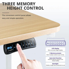 In den dreiteiligen Teleskopbeinen des Gestells verbaut der Hersteller zwei leise Motoren. Diese lassen sich über die Steuerung an der Tischplatte hoch- und herunterfahren. Die einstellbare Höhe liegt zwischen 62 und 127 cm, was für die meisten Körpergrößen passen sollte. Wie hoch die Tischplatte gerade über dem Boden schwebt, zeigt ein kleines Display an. Zudem lassen sich drei favorisierte Positionen einspeichern und dann bequem per Knopfdruck aufrufen.