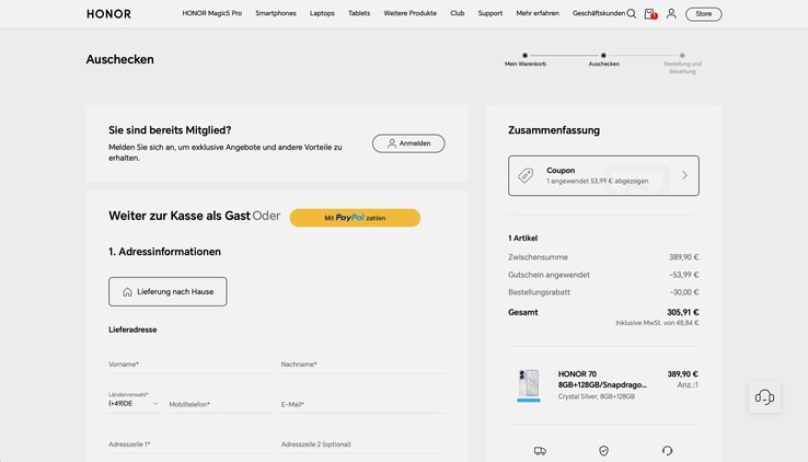 Das Honor 70 ist im Preisvergleich aktuell nicht unter 389 Euro zu finden, im Onlineshop des Herstellers wird das Basismodell mit 8 GB Arbeitsspeicher und 128 GB Flash-Speicher derzeit aber für nur 305,91 Euro angeboten, solange der Gutscheincode "ADECPS03" an der Kasse angegeben wird.
