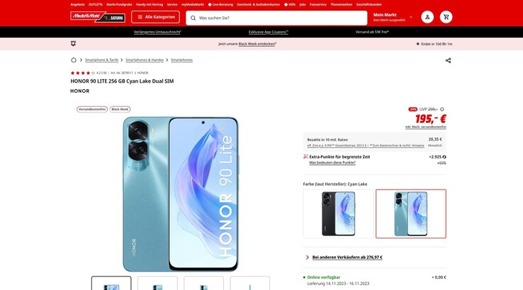 Das Honor 90 Lite kann im Rahmen der "Black Week" schon anderthalb Wochen vor dem Black Friday zum Bestpreis bestellt werden, denn MediaMarkt und Saturn bieten das Mittelklasse-Smartphone in Deutschland für jeweils 195 Euro an, wahlweise in Blau oder in Schwarz. Kunden aus Österreich finden das Gerät dagegen bei Gomibo für 197 Euro.