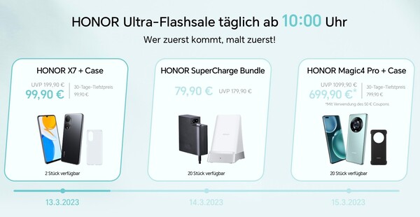 Morgen, am 14. März gibt es das Honor SuperCharger Bundle mit maximal 100 Watt zum Angebotspreis im Flash-Sale von Honor für nur 79,90 Euro, statt 99 Euro. Übermorgen verkauft Honor das Smartphone Magic4 Pro mit Case zum unglaublichen Tiefpreis von nur 699,90 Euro. Den UVP für das Honor-Smartphone mit 8/256 GByte Speicher und schnellem Snapdragon 8 Gen 1 von Qualcomm gibt Honor mit 1.099 Euro an. Aktuell kostet das Magic4 Pro mit 100 Watt starkem SuperCharger bei Honor 749,90 Euro.