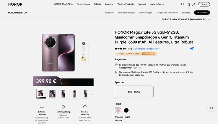 Honor legt ein kostenloses 66 Watt USB-C-Ladegerät und einen 180-Tage-Ersatz-Service dazu, sodass das Smartphone bei Schäden in den ersten 180 Tagen ab dem Kaufdatum kostenlos ersetzt wird. Das Magic7 Lite besitzt 8 GB Arbeitsspeicher und 512 GB Flash-Speicher, Käufer haben die Wahl zwischen der Farbe Titanium Purple und Titanium Black.