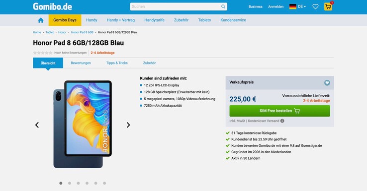 Das Honor Pad 8 kam im vergangenen Oktober für eine unverbindliche Preisempfehlung von 349 Euro auf den Markt, aktuell kann das Tablet bei Gomibo für nur 225 Euro bestellt werden. Es handelt sich dabei um das Modell in Dunkelblau mit 6 GB RAM und 128 GB Flash-Speicher. Im Preisvergleich ist das Tablet ansonsten nicht unter 258 Euro zu finden.