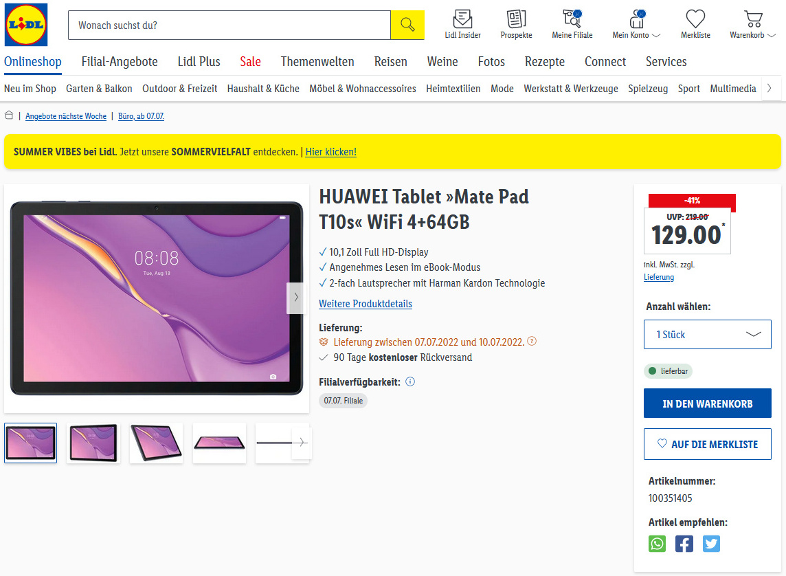 Der Discounter Lidl verkauft momentan wieder ein sehr günstiges 10,1-Zoll-Tablet von Huawei. Das Huawei Mate Pad T10s kostet als Wi-Fi-Modell gerade einmal 129 Euro an. Das ist ein fairer und günstiger Preis für das Android-Tablet mit Full HD IPS-Display (1.920 x 1.200 Pixel) und Kids Corner Kindersicherung. Erhältlich ist das Huawei-Tablet im Onlineshop von Lidl.