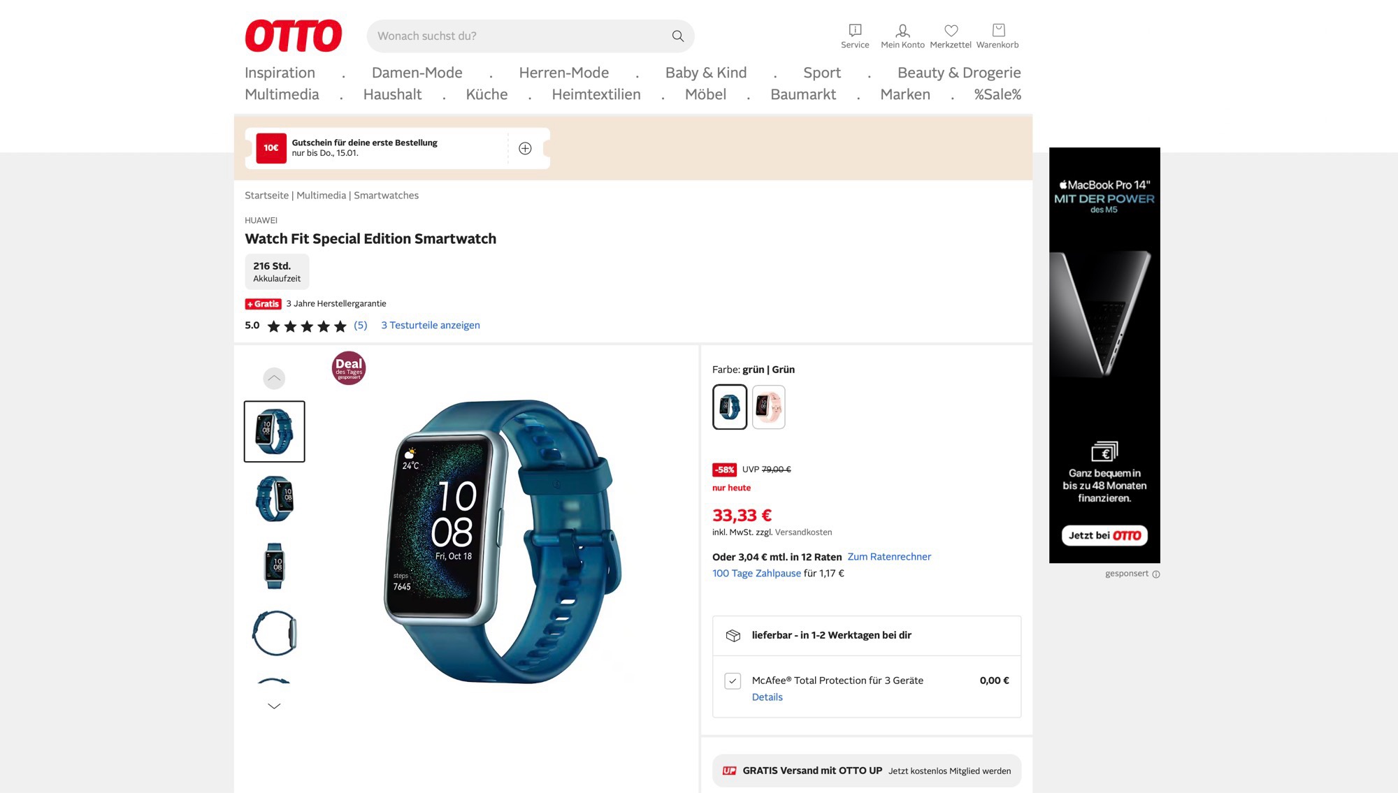 Die Huawei Watch Fit Special Edition wird aktuell bei Otto für nur 33,33 Euro angeboten. Der Versand kostet regulär 4,95 Euro, wer sich für ein kostenloses Otto Up Konto registriert und einen Mindestbestellwert von 59,95 Euro erreicht, erhält kostenlosen Versand. Die Huawei Watch Fit Special Edition ist im Juli 2023 für 99,99 Euro auf den Markt gekommen, und ist im Preisvergleich aktuell ansonsten nicht unter 39,90 Euro zu finden.
